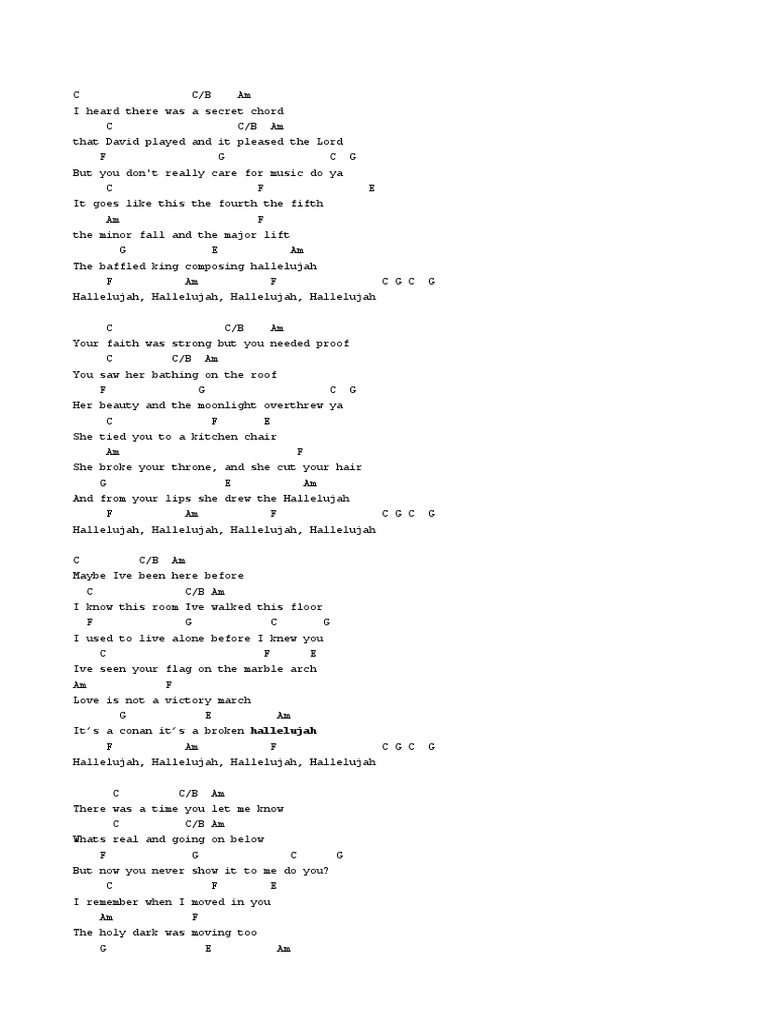 C am your faith was strong, but you needed proof c am you saw her bathing on the roof f g c g her beauty and the moonlight overthrew you c f g she tied you to a kitchen chair am f she broke your throne and she cut your hair. Learn hallelujah faster with songsterr plus plan! C g c g hallelujah. C f g she tied you to her kitchen chair. Free and guaranteed quality with ukulele chord charts, transposer and auto scroller.